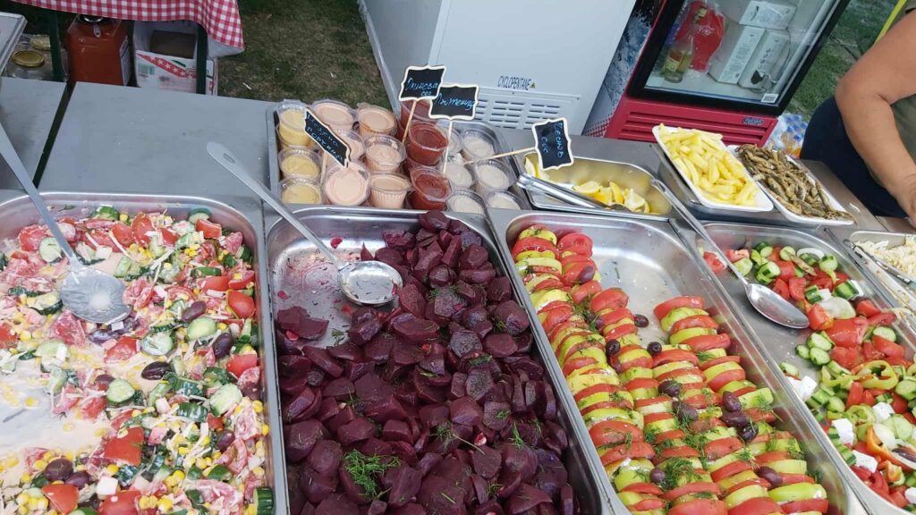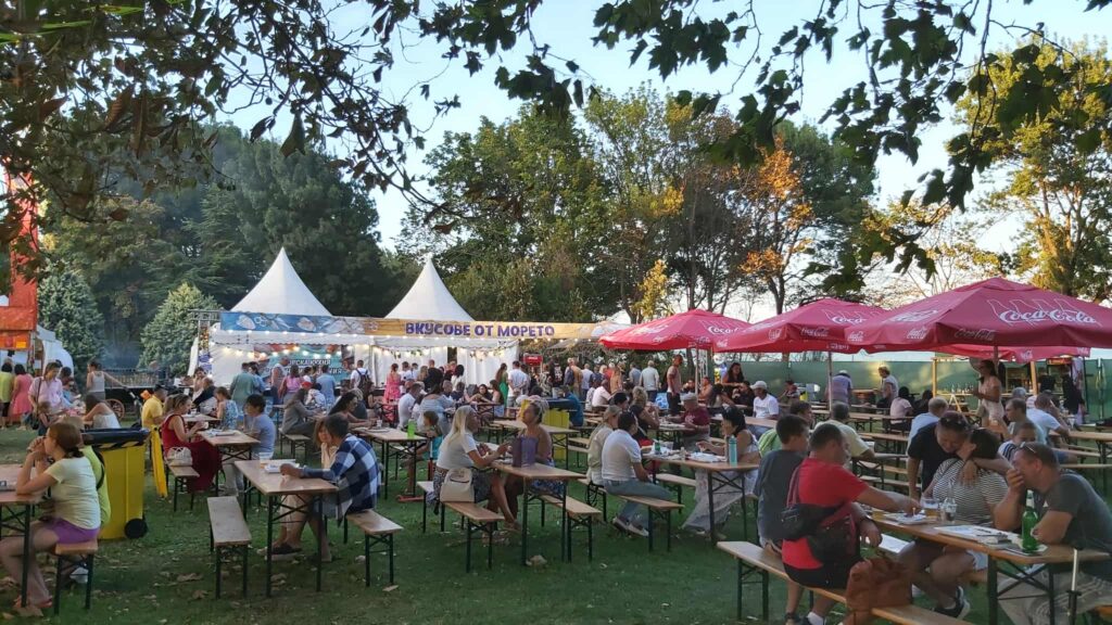 Фестиваль «Рыбы и вина» проходит в Морском парке Бургас возле экспоцентра «Флоры» в этом году с 4-го по 8-е сентября целых 5 дней веселья. Понедельник нерабочий день (ссылка праздники в сентябре). Программа фестиваля разнообразная на фото можно ознакомиться по дням: это и кулинарные шоу, детские конкурсы, танцевальные программа, дегустация вина, концерты, огненное шоу и др. Купить вкусности можно только по карте с некоторыми ценами тоже можно ознакомиться на фото. На фестивале представлены блюда в основном из морепродуктов, очень богатый выбор рыбы, также есть салаты, овощные блюда и разные сладости, чуррос, сладкая вата, бабл вафли, козуначени коминчета.